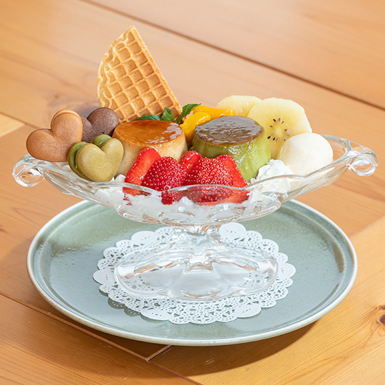 木楽楽オリジナルのオーツミルクやオートミールを使った2種類のプリンの味わえるプリンアラモードです。プリンと抹茶プリン、クッキー、3つの味のかわいいハート型の飛鳥山カステーラのほかに季節ごとにおいしいフルーツを盛り合わせてお作りいたします。見た目にも鮮やかなダブルプリンアラモードをぜひお楽しみください。