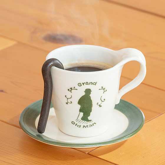 渋沢栄一さんのシルエットの描かれたカップにたっぷりのブレンドコーヒー。マドラーは杖の形です。
