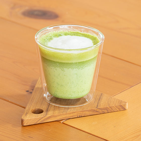 カフェラテと抹茶ラテをご用意しています。抹茶ラテは、静岡県産の抹茶をといてお作りする本格派。お好みで甘みを足してお楽しみください。
