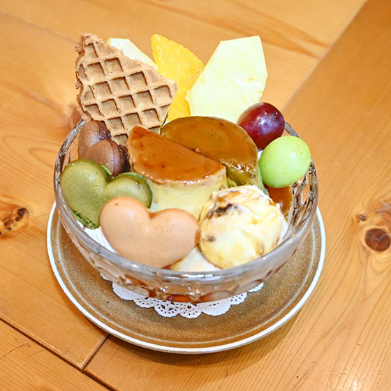 オーツミルクを使用した2種類のプリンと、飛鳥山ベビーカステーラ、オートミールクッキー、フルーツ、アイスクリームなどの盛り合わせで、クッキーもオートミール粉を使用して作った木楽楽オリジナルです。