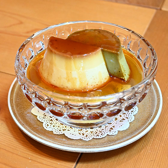 プレーン、抹茶の2種類のプリンそれぞれハーフサイズに、フルーツの乗ったかわいいプリンアラモードです。